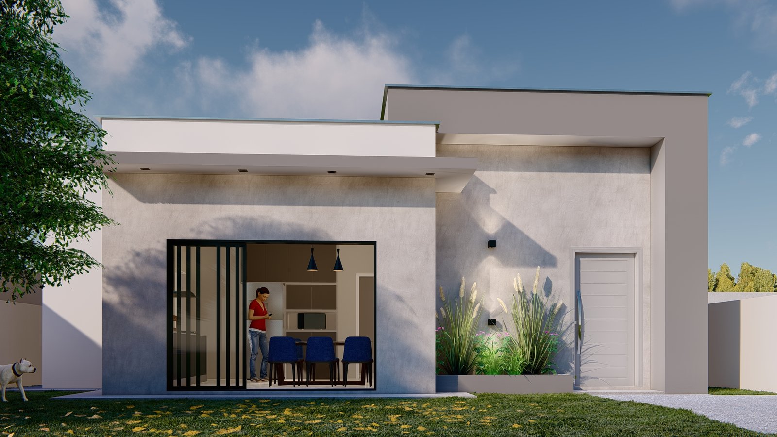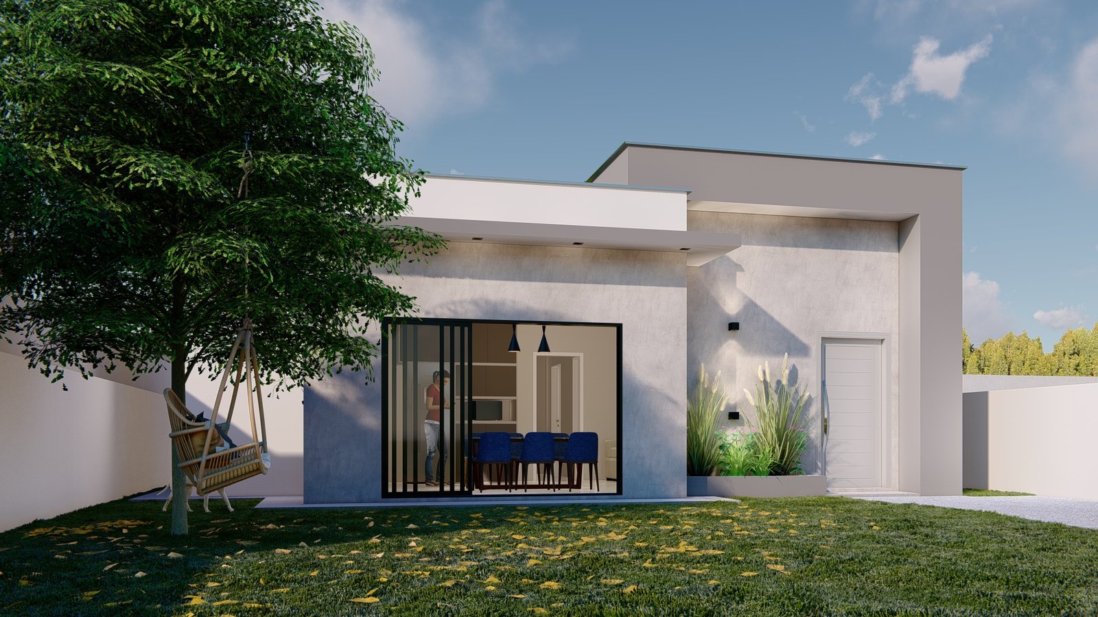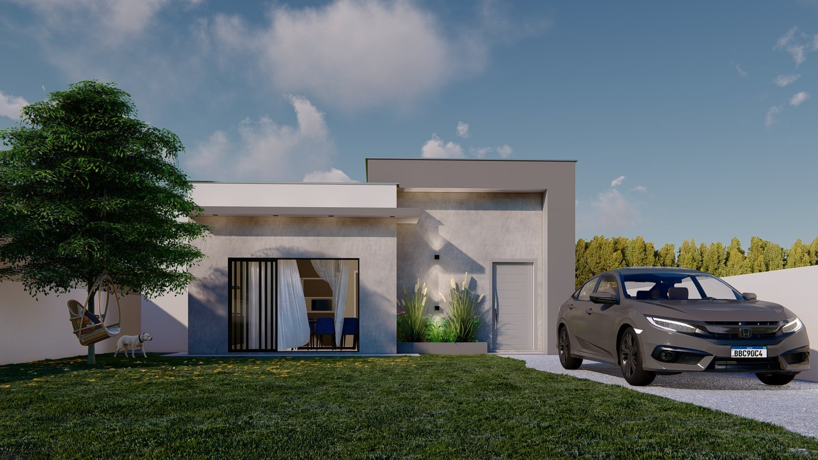 Com uma proposta moderna e bem definida, este projeto térreo se destaca pela sua estética marcante e pela organização inteligente dos espaços. A composição da fachada valoriza linhas retas e volumes equilibrados, criando um visual elegante e atemporal que chama atenção logo no primeiro olhar.
